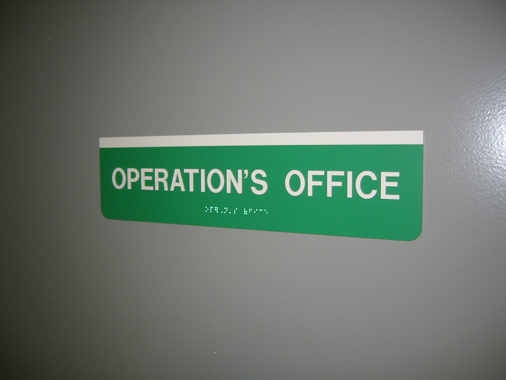 703.4.2 Location. Where a tactile sign is provided at a door, the sign shall be located alongside the door at the latch side. Where a tactile sign is provided at double doors with one active leaf, the sign shall be located on the inactive leaf. Where a tactile sign is provided at double doors with two active leafs, the sign shall be located to the right of the right hand door. Where there is no wall space at the latch side of a single door or at the right side of double doors, signs shall be located on the nearest adjacent wall. Signs containing tactile characters shall be located so that a clear floor space of 18 inches (455 mm) minimum by 18 inches (455 mm) minimum, centered on the tactile characters, is provided beyond the arc of any door swing between the closed position and 45 degree open position.